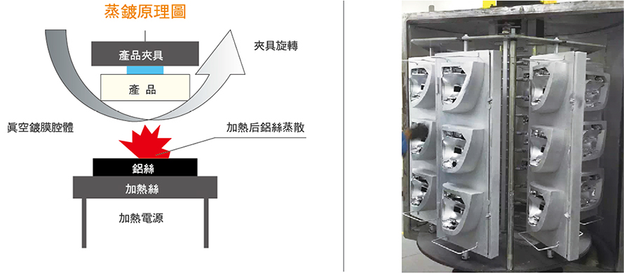 左圖:在適當的真空環境下給加熱絲通一定電壓的電使放在加熱絲上的鋁絲蒸散到旋轉的產品表面,達到鍍鋁的目的。